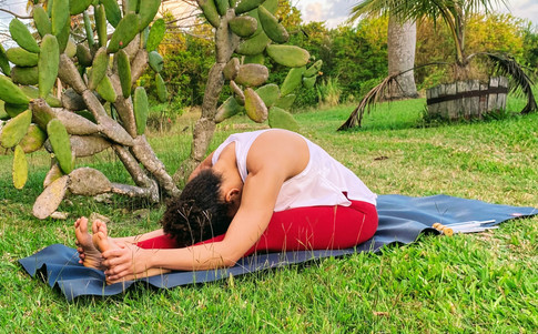 In caterpillar your legs may touch or be slightly apart. Bend forward, allow gravity to ease your chest towards the floor. There should be a gentle to moderate stretch along the back of your spine. If your hamstrings are tight or the stretch feels too intense you may want to use a bolster or cushion under your knees. Stimulate LR3, either one side at a time or both points together. Afterwards release the head down, come into motionlessness. Stay in the pose for 3 to 5 mins. A simple counter-stretch like tabletop or windshield wipers may feel good after this pose.